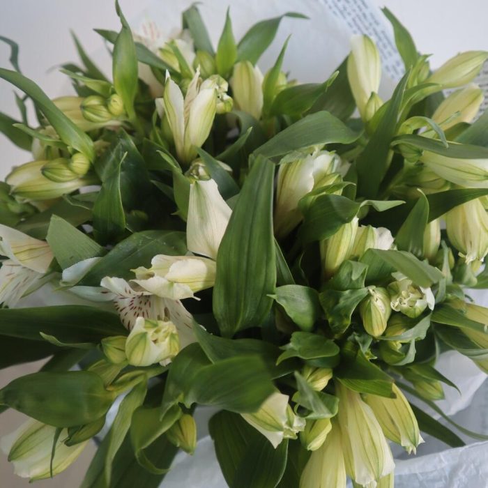 Альстромерия белая – 9 шт.Тишью белое – 2 шт.Крафт газета – 2 шт.Рафия – 1 шт.