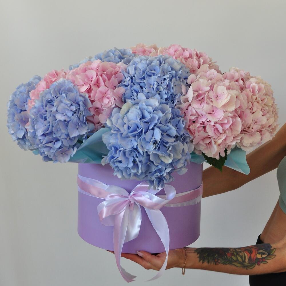 Гортензия – 21 шт.Лента атласная – 2 шт.Коробка шляпная – 1 шт.Оазис флористический – 6 шт.