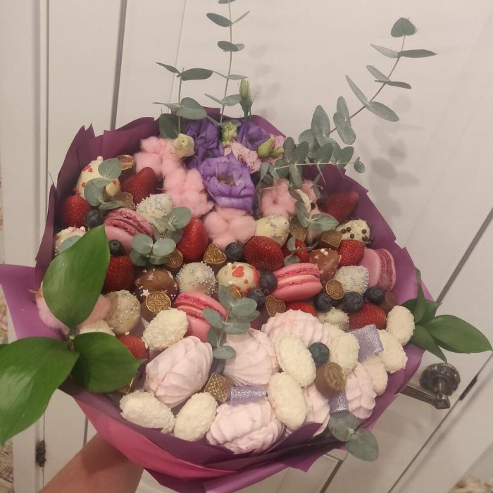 Клубника – 13 шт.Голубика – 10 шт.Лизиантус сиреневый – 4 шт.Хлопок натуральный – 7 шт.Лизиантус алиса пинк – 3 шт.макарон (пирожное) – 4 шт.Зефир клубничный – 6 шт.Клубника в шоколаде callebaut (бельгия) – 14 шт.зелень декоративная – 4 шт.конфеты кокосовые – 12 шт.транспортировочная упаковка – 1 шт.Упаковка дизайнерская – 1 шт.конфеты золотые – 16 шт.