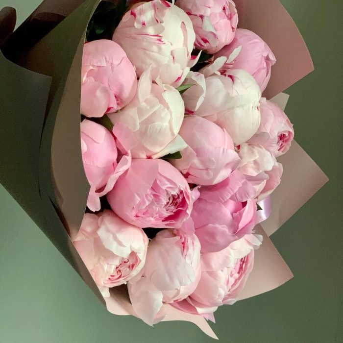 Лента – 3 шт.Тишью – 2 шт.Упаковка дизайнерская – 4 шт.пион розовый сара бернар – 15 шт.