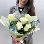Упаковка – 1 шт.Роза белая мондиаль – 5 шт.Эвкалипт ценерея – 3 шт.