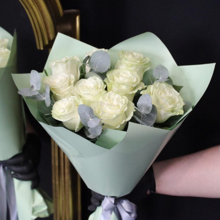 Роза Эквадор Мондиаль – 9 шт.Эвкалипт – 3 шт.Пленка матовая – 4 шт.Лента атласная – 2 шт.