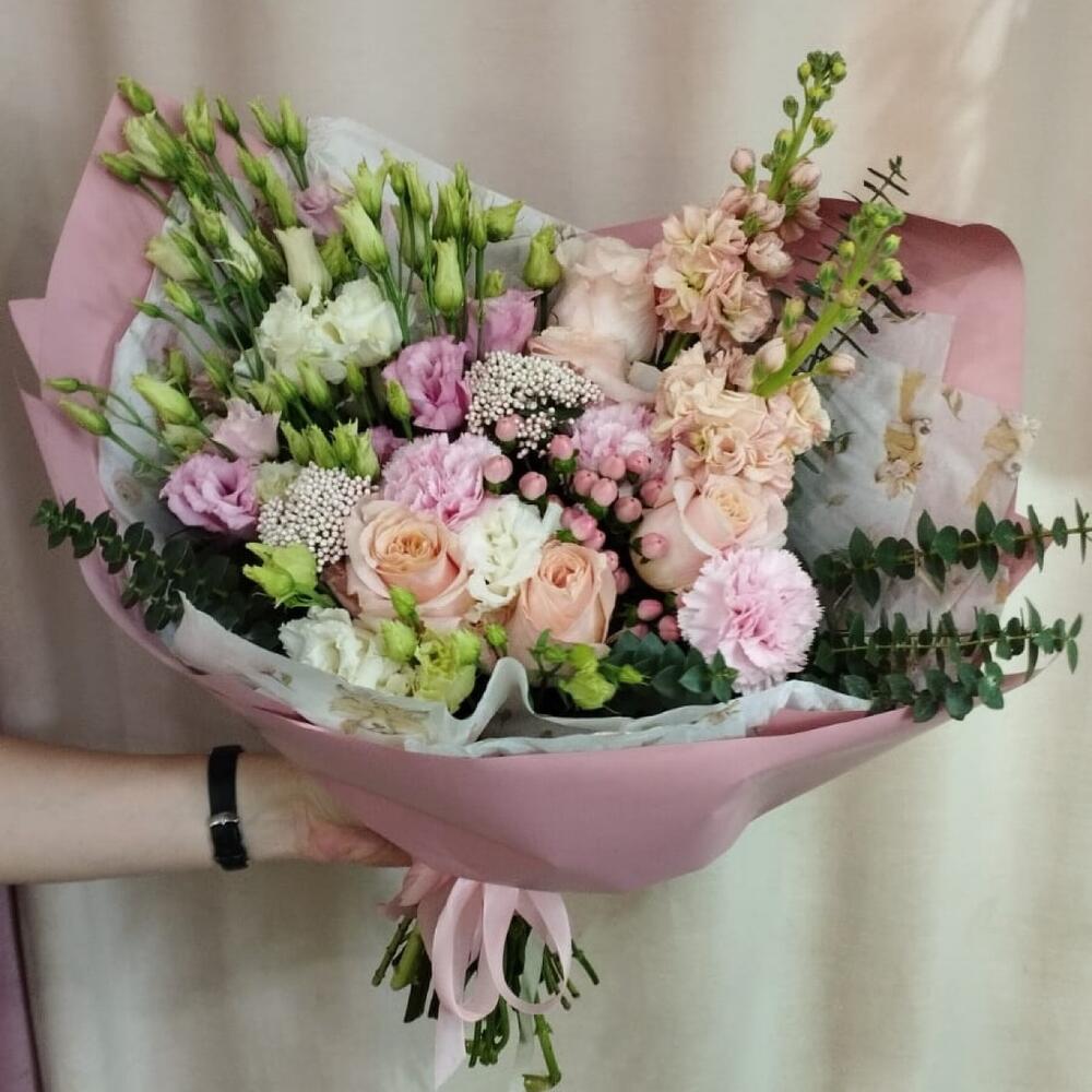 Роза – 3 шт.лекоспермум – 1 шт.Лизиантус – 3 шт.Маттиола – 2 шт.Хризантема кустовая – 1 шт.Роза кустовая – 1 шт.Эвкалипт – 2 шт.