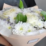 Лимониум – 1 шт.Рускус – 3 шт.Хризантема кустовая – 4 шт.Лента атласная – 1 шт.Упаковка дизайнерская – 1 шт.Роза одноголовая эквадор – 3 шт.тишью белая – 1 шт.