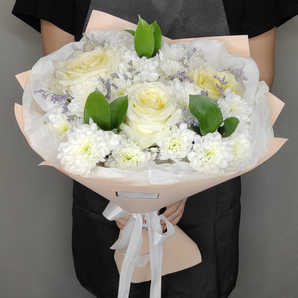 Букет ароматных роз, хризантемы и лилового лимониума "Нежность"