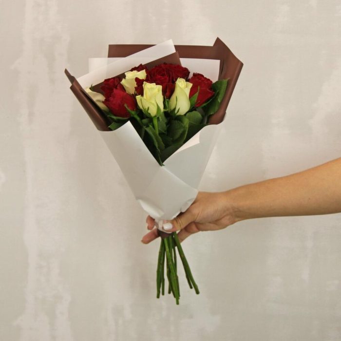 Букет из 11 красных и белых роз микс 35-40 см (Кения) в стильной упаковке