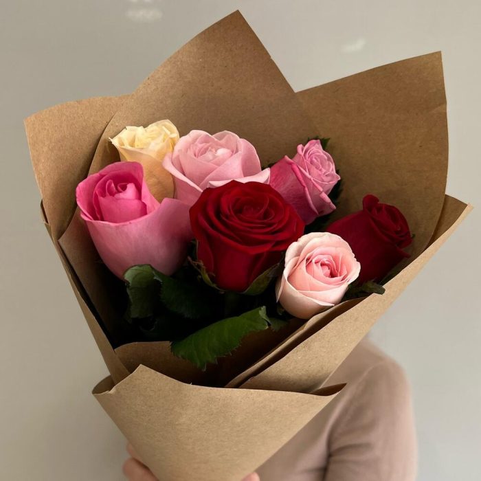 Роза – 7 шт.Лента атласная – 1 шт.Упаковка дизайнерская – 1 шт.