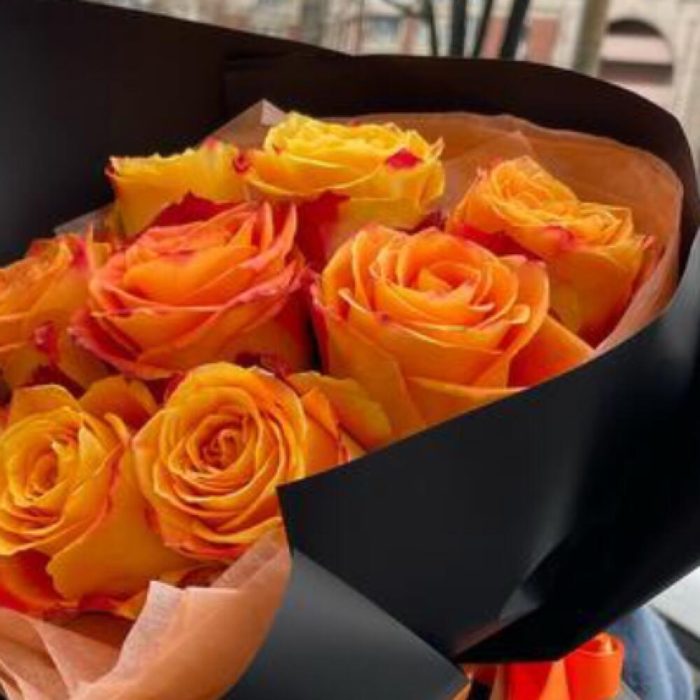 Роза Эквадор – 9 шт.Лента атласная – 6 шт.Тишью – 2 шт.Пленка матовая – 2 шт.