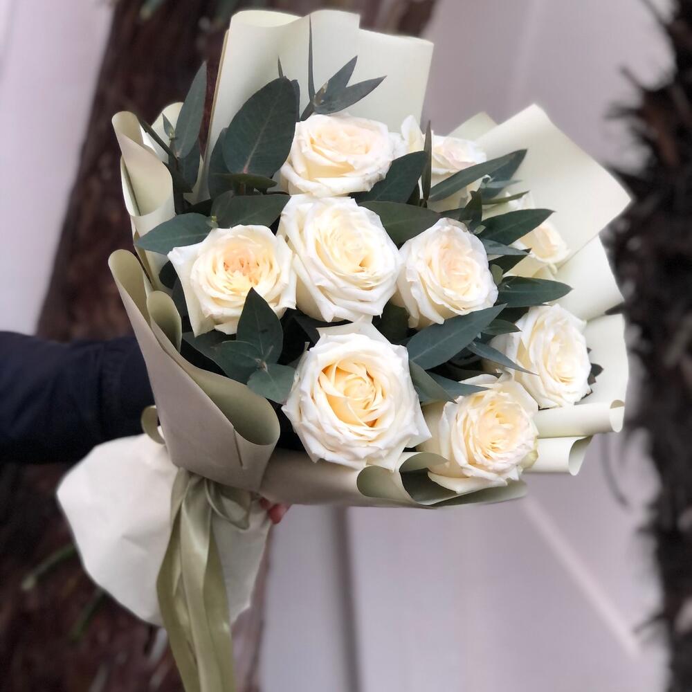 Лента – 2 шт.Эвкалипт – 4 шт.Упаковка дизайнерская – 1 шт.Роза белая эквадор – 9 шт.