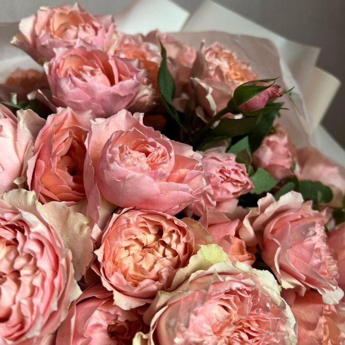 Эвкалипт – 5 шт.Атласная лента – 1 шт.джульетта роза пионовидная – 11 шт.декоративная упаковка – 1 шт.
