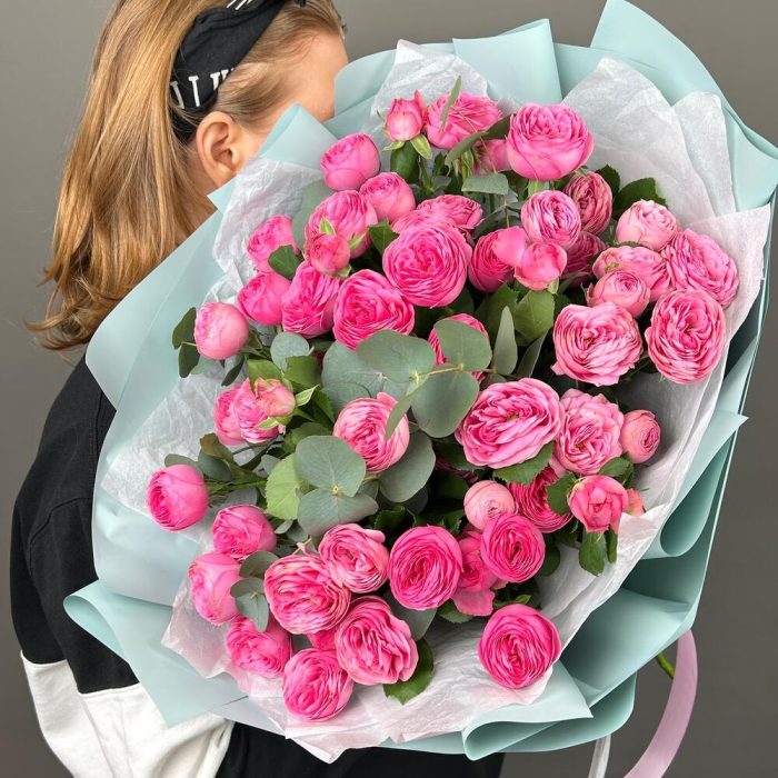 Эвкалипт – 4 шт.Дизайнерская упаковка – 2 шт.роза жизель – 9 шт.