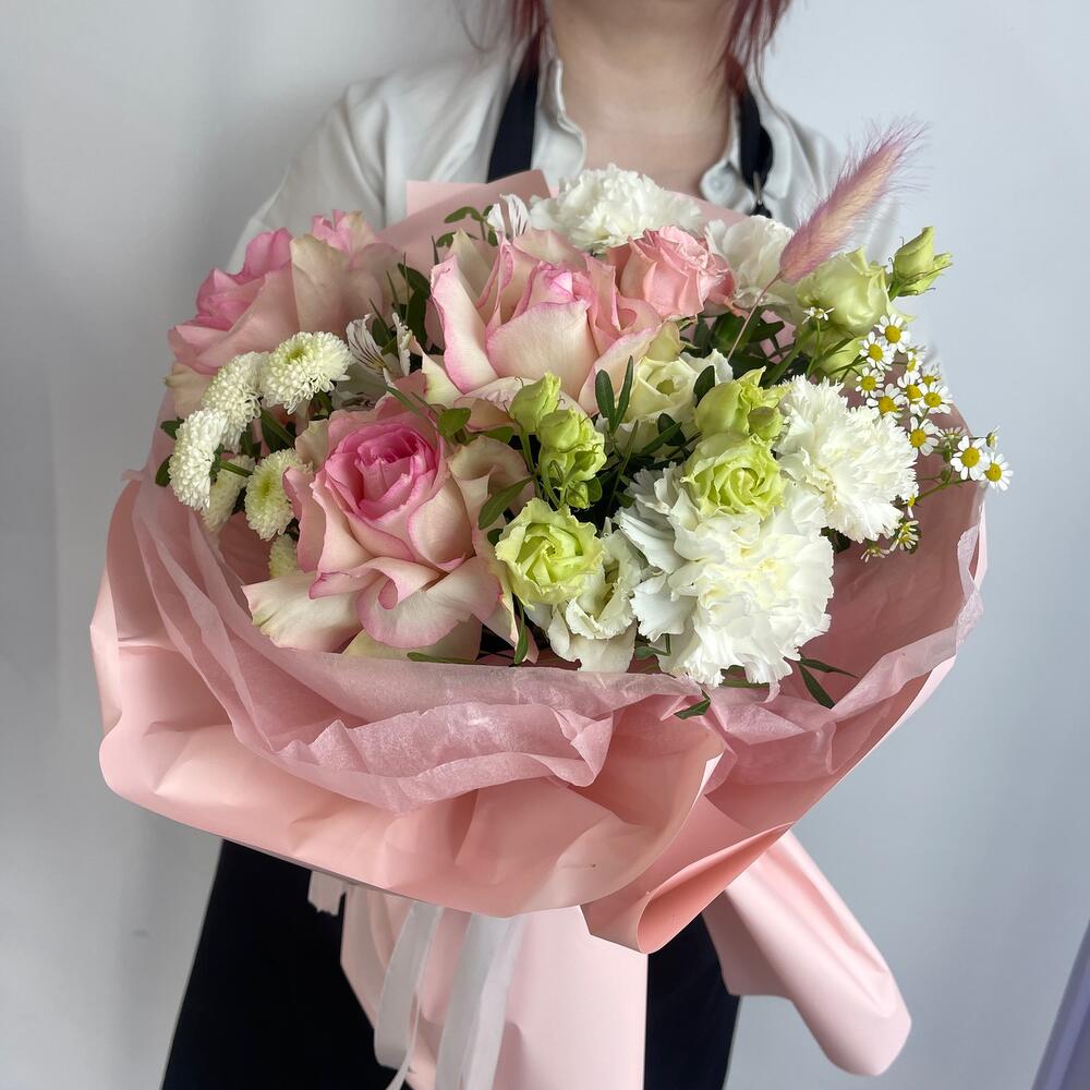 Сантини белая – 1 шт.Кустовая роза – 1 шт.Диантус – 3 шт.Пленка – 4 шт.Французская роза – 3 шт.эустома белая – 1 шт.фисиашка зелень – 4 шт.тиштю белая – 2 шт.