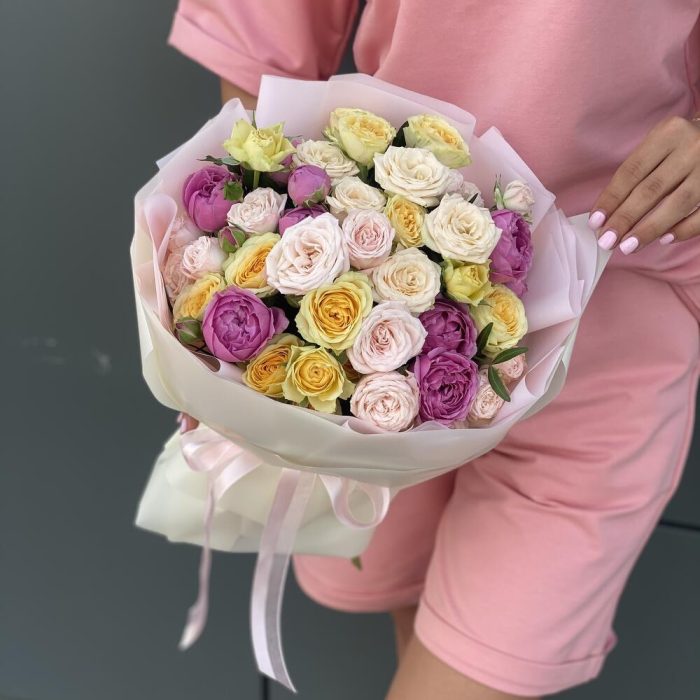 Букет Юбилейный из кустовых пионовидных роз и хризантемы
