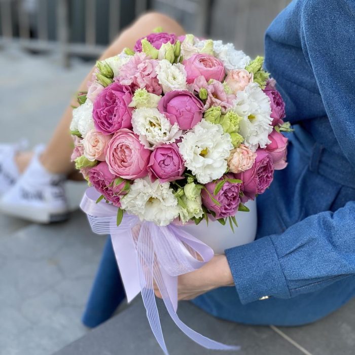 Коробка шляпная – 1 шт. Оазис – 1 шт. Лента – 2 шт. Misty Bubbles пионовидная роза – 3 шт. Сильвия – 2 шт. Бомбастик роза – 1 шт. Писташ – 1 шт. Эустома алиса – 4 шт.