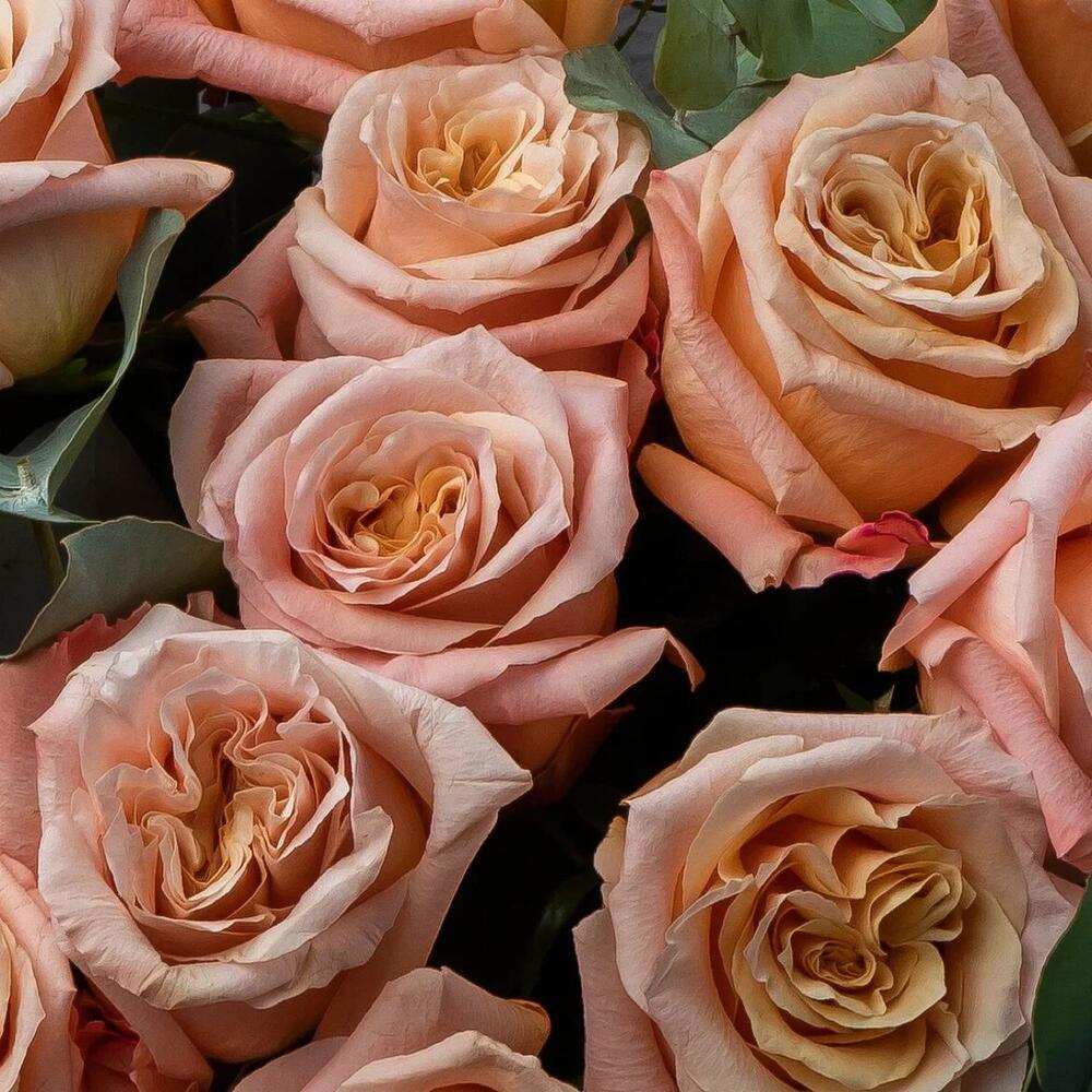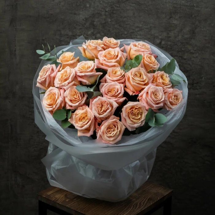 Моно букет из стойких роз персикового цвета и декоративной зеленью