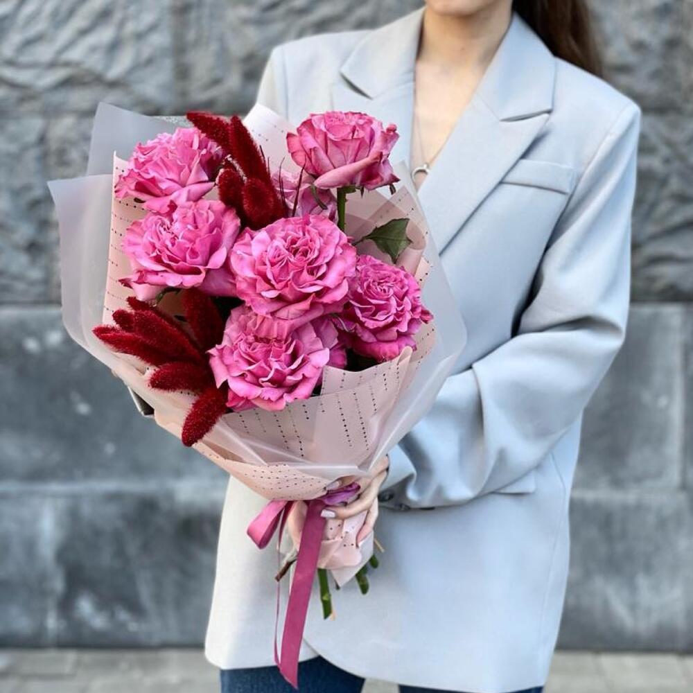 розы пионовидные – 7 шт.сетария пучок – 2 шт.Упаковка дизайнерская – 1 шт.Лента атласная – 1 шт.